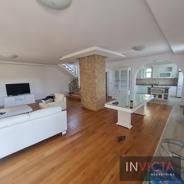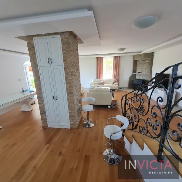 EKSKLUZIVNO PRAVO PRODAJE! U središnom delu Popovice, maloj mirnoj, slepoj ulici, na parceli sa potpunom privatnošću, luksuzna kuća sa bazenom, ekskluzivna lokacija, Popovica (F. Gora-cca 12km od centra N. Sada), stambene površine 660m2 (glavna kuća)+cca 90m2 pomoćni objekat (posebna kuća za goste ili pomoćno osoblje, ostave) na parceli površine 3500m2 sa prelepim pogledom na obronke Fruške Gore. Ograđena parcela sa kapijom od kovanog gvožđa (daljinsko upravljanje). Deo parcele je oplemenjen četinarima, deo je pokriven travnatim površinama, dok je na jednom delu vinograd. Glavna zgrada u prizemnom delu ima dve garaže, na visokom prizemlju prostrani dnevni boravak sa kuhinjom i trpezarijskim delom (cca 60m2) oivičen terasom, toalet, kupatilo, garderober. Na spratu su 4 prostrane spavaće sobe sa terasama i kupatilom, dok je u potkrovlju zaseban apartman, sa manjom čajnom kuhinjom, šankom, dnevnim i spavaćim delom sa jakuzzi kadom, te posebnim kupatilom. Gostinska kuća je komforna sa dve spavaće sobe, kupatilom i velikim dnevno-kuhinjsko-trpezarijskim delom. Kraj bazena dimenzija 8x4x1, 5m, sa jakuzzi masažerom i pomoćne prostorije sa roštiljem. Kvalitetna gradnja, ugrađena vrhunska oprema. U ceni i nova kuhinja, nameštaj u kući, svi ugradni plakari, sve nekorišćeno. Prilaz imanju obezbeđen sa dve kapije na daljinsko upravljanje (predulaz i ulaz). Br. u Reg. posredn. 475.